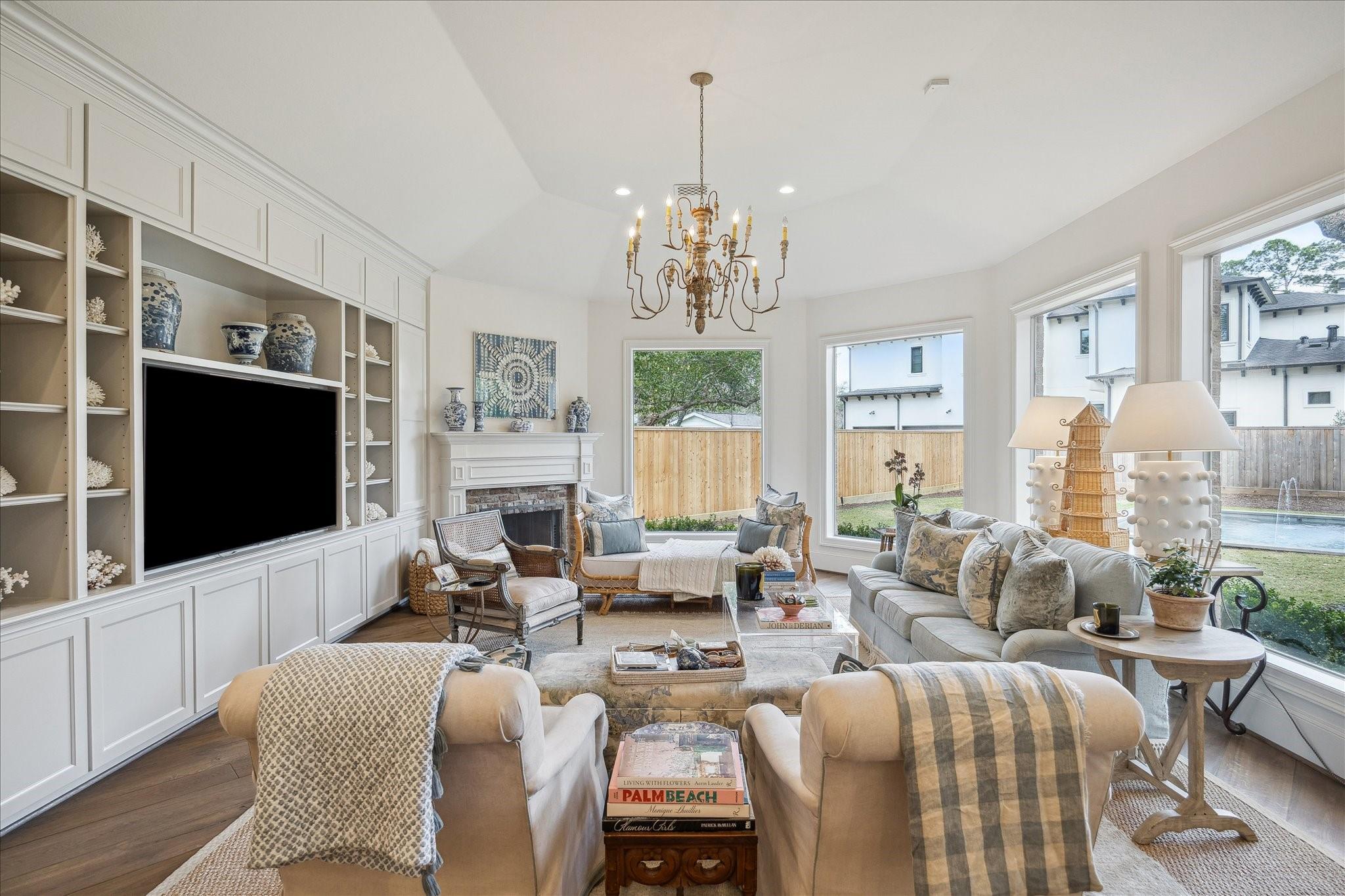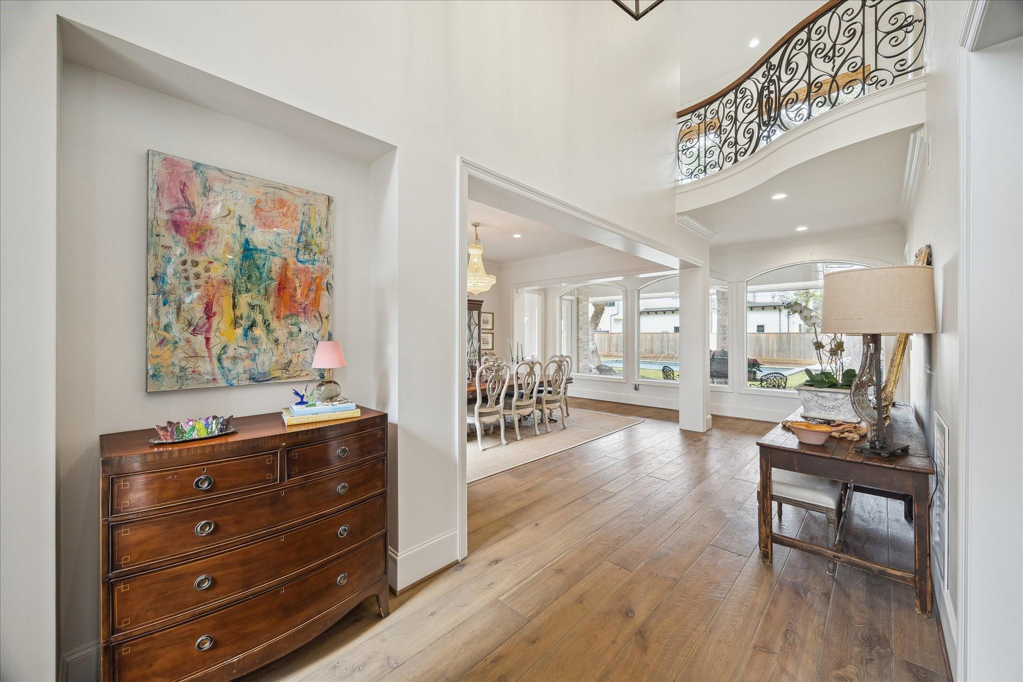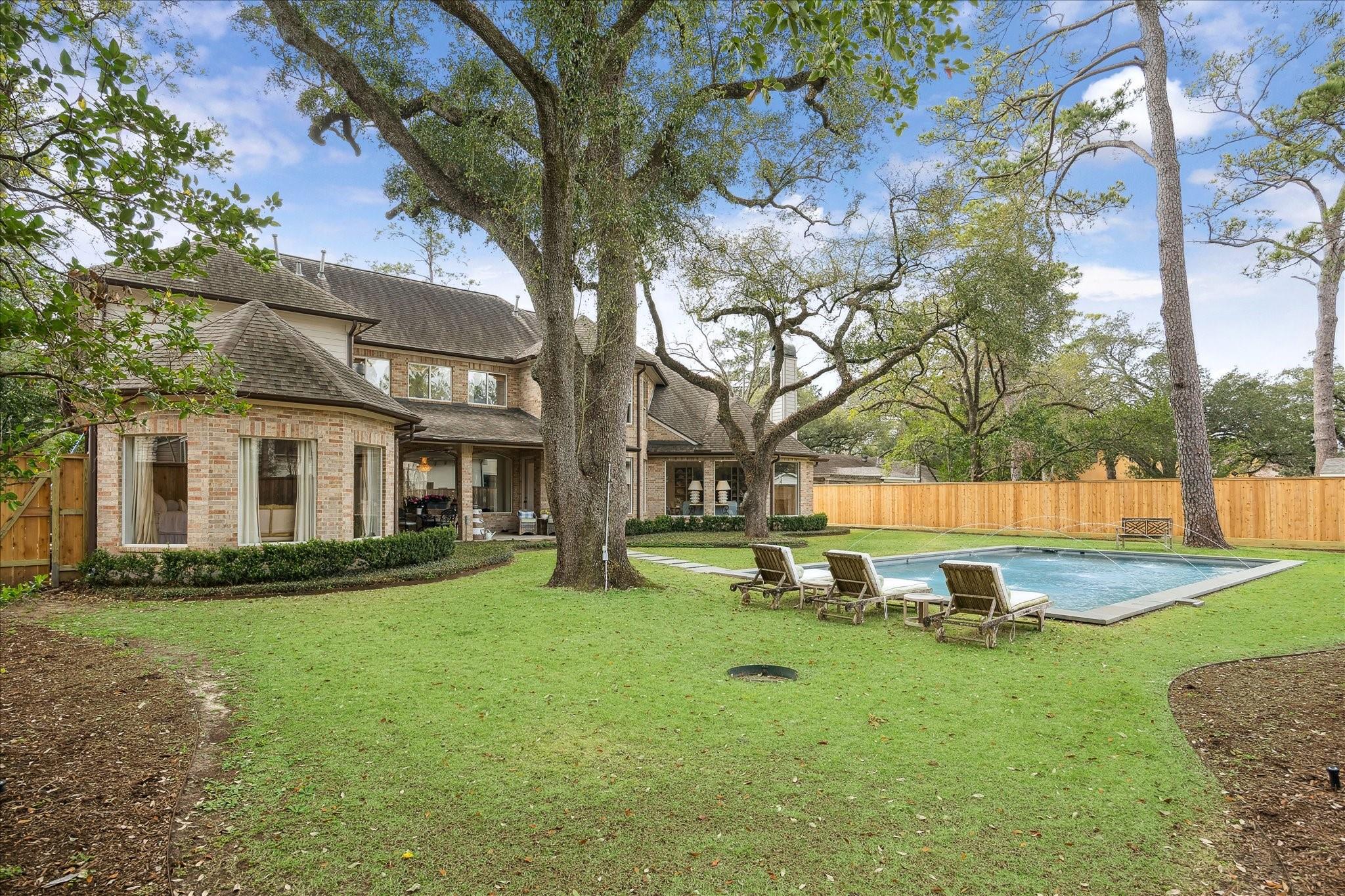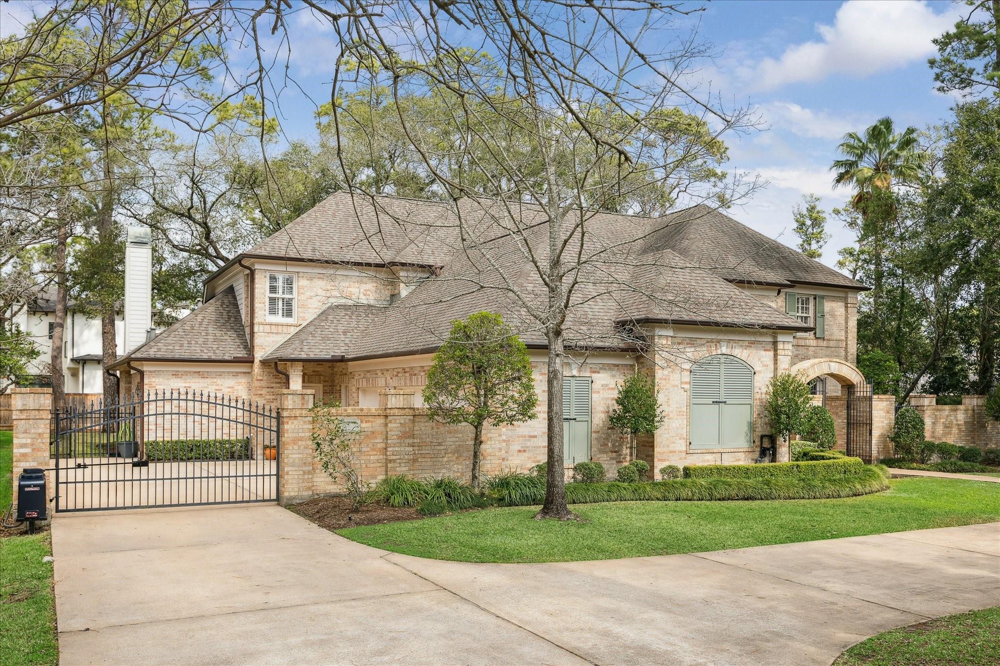 Located in the heart of Hedwig Village, this custom brick home sits on an expansive lot, offering the kind of scale that is increasingly rare in Memorial. Built in 1997 and thoughtfully updated, the home blends timeless architecture with curated interiors, high ceilings, and rich french oak floors. A gated courtyard entry and circle drive create an impressive arrival, complemented by copper gutters, working shutters, a gated motor court, and a three-car garage. The kitchen, reimagined in 2025, features a white oak island, honed calacatta marble, Sub-Zero and Wolf appliances, a custom plaster hood by Segreto, and a custom ceramic mural backsplash. It opens to the family room with a wood-burning fireplace and panoramic views of the backyard. The primary suite is located on the first floor, while the second level features four additional bedrooms, two Hollywood baths, and a central game room. The backyard features a bluestone pool with fountains, mature oaks, and generous green space.