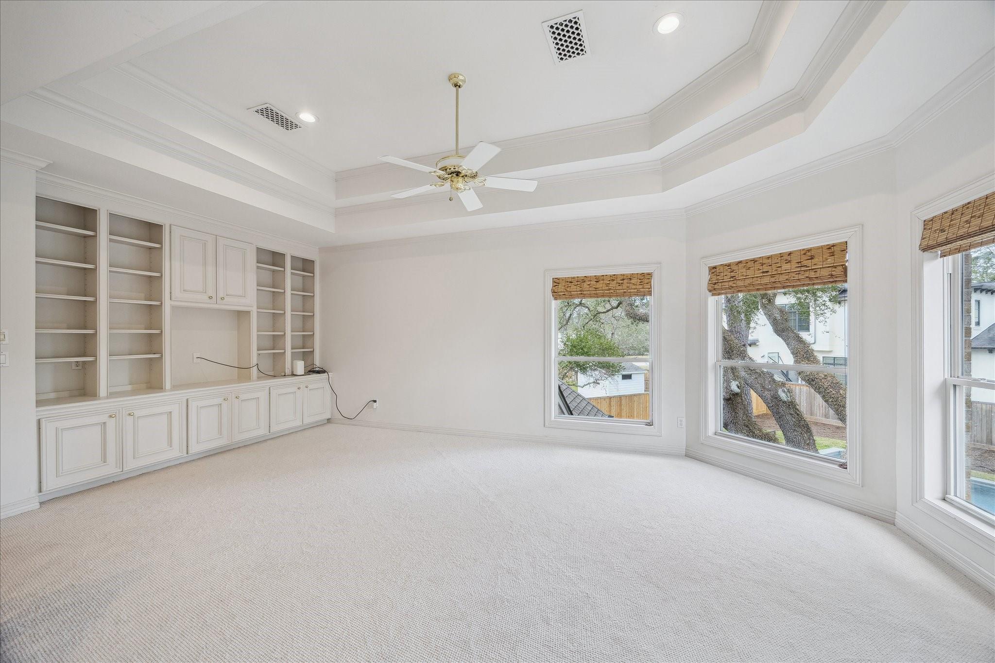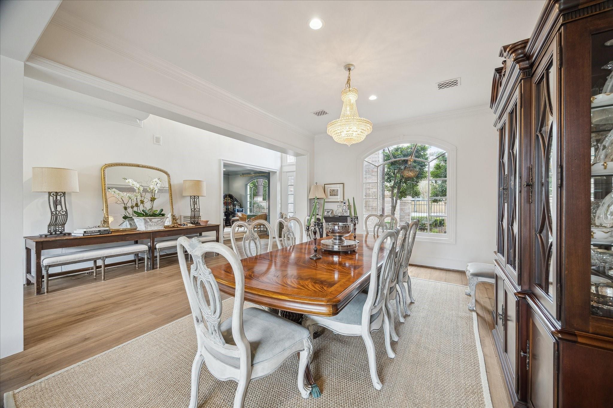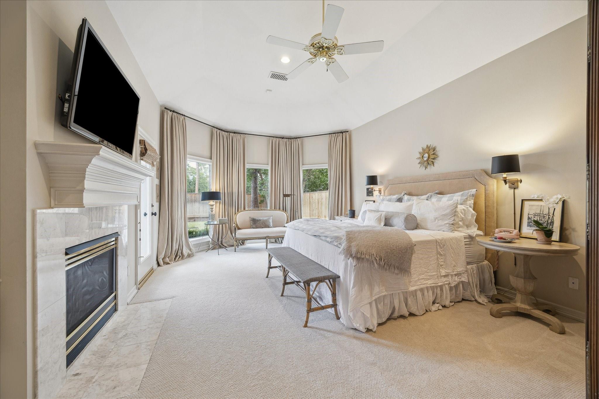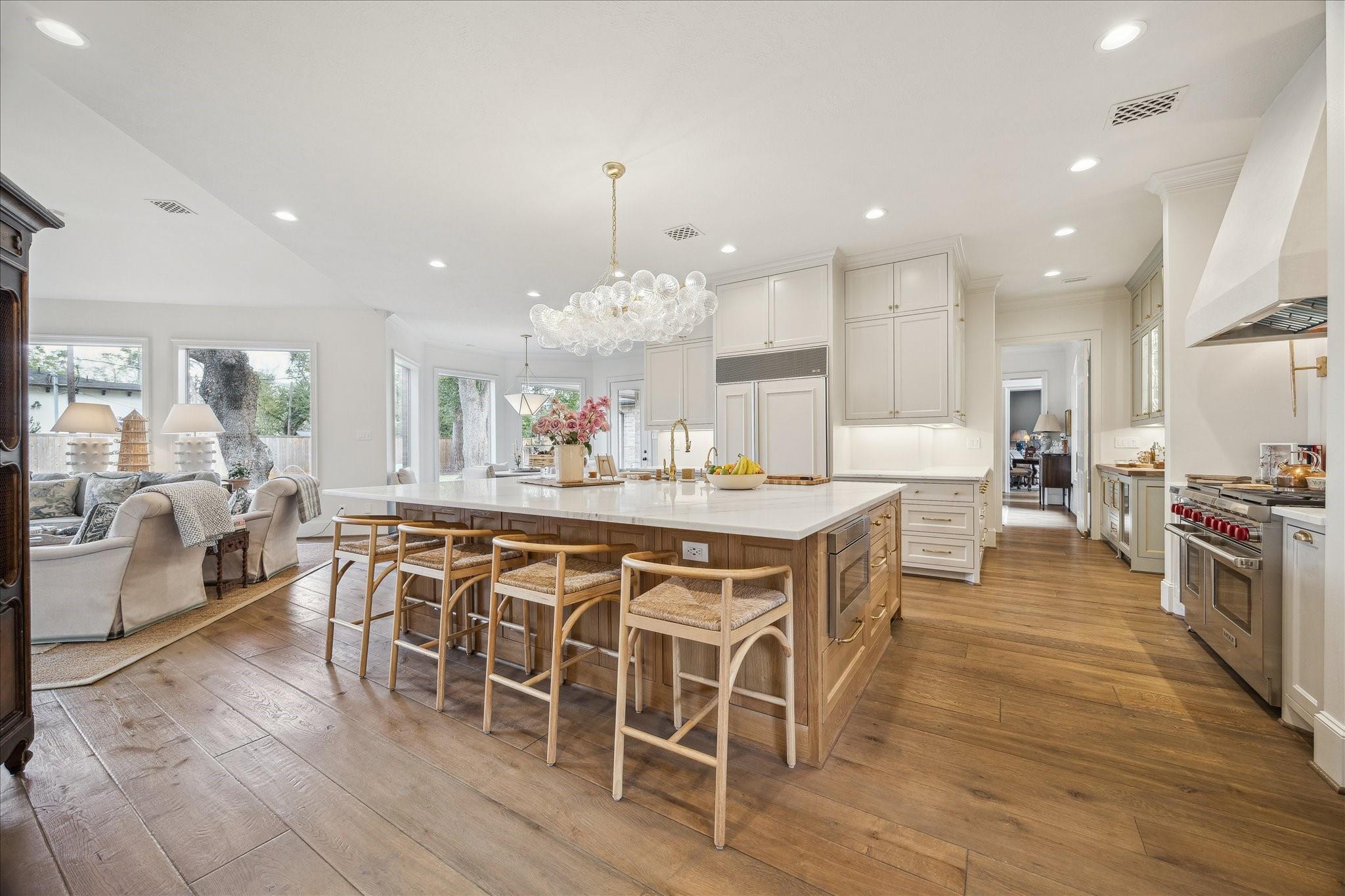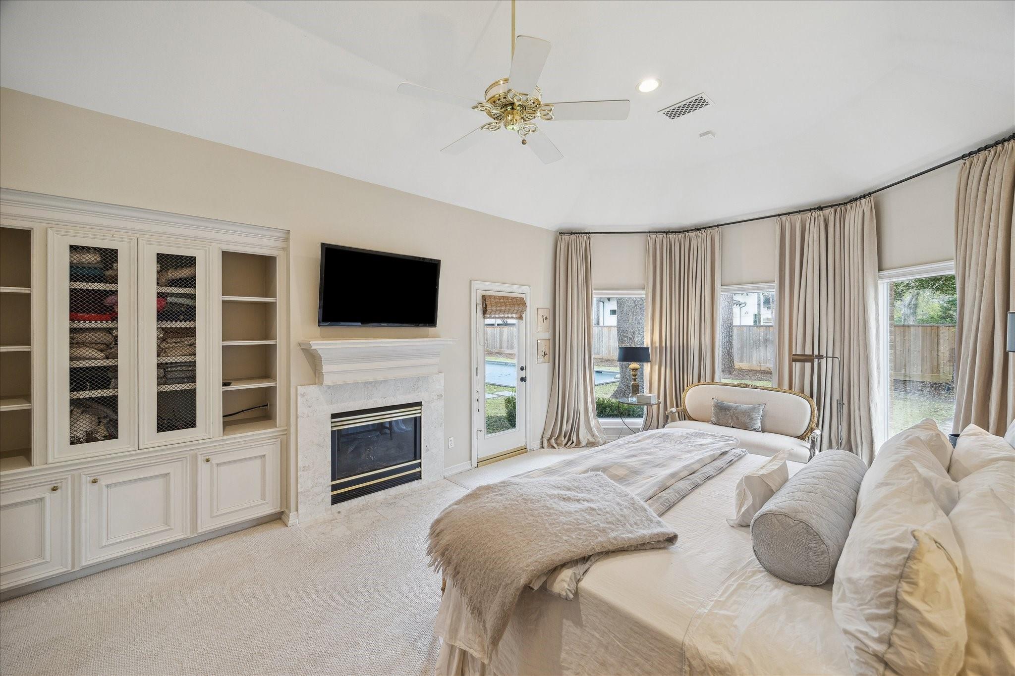 Located in the heart of Hedwig Village, this custom brick home sits on an expansive lot, offering the kind of scale that is increasingly rare in Memorial. Built in 1997 and thoughtfully updated, the home blends timeless architecture with curated interiors, high ceilings, and rich french oak floors. A gated courtyard entry and circle drive create an impressive arrival, complemented by copper gutters, working shutters, a gated motor court, and a three-car garage. The kitchen, reimagined in 2025, features a white oak island, honed calacatta marble, Sub-Zero and Wolf appliances, a custom plaster hood by Segreto, and a custom ceramic mural backsplash. It opens to the family room with a wood-burning fireplace and panoramic views of the backyard. The primary suite is located on the first floor, while the second level features four additional bedrooms, two Hollywood baths, and a central game room. The backyard features a bluestone pool with fountains, mature oaks, and generous green space.