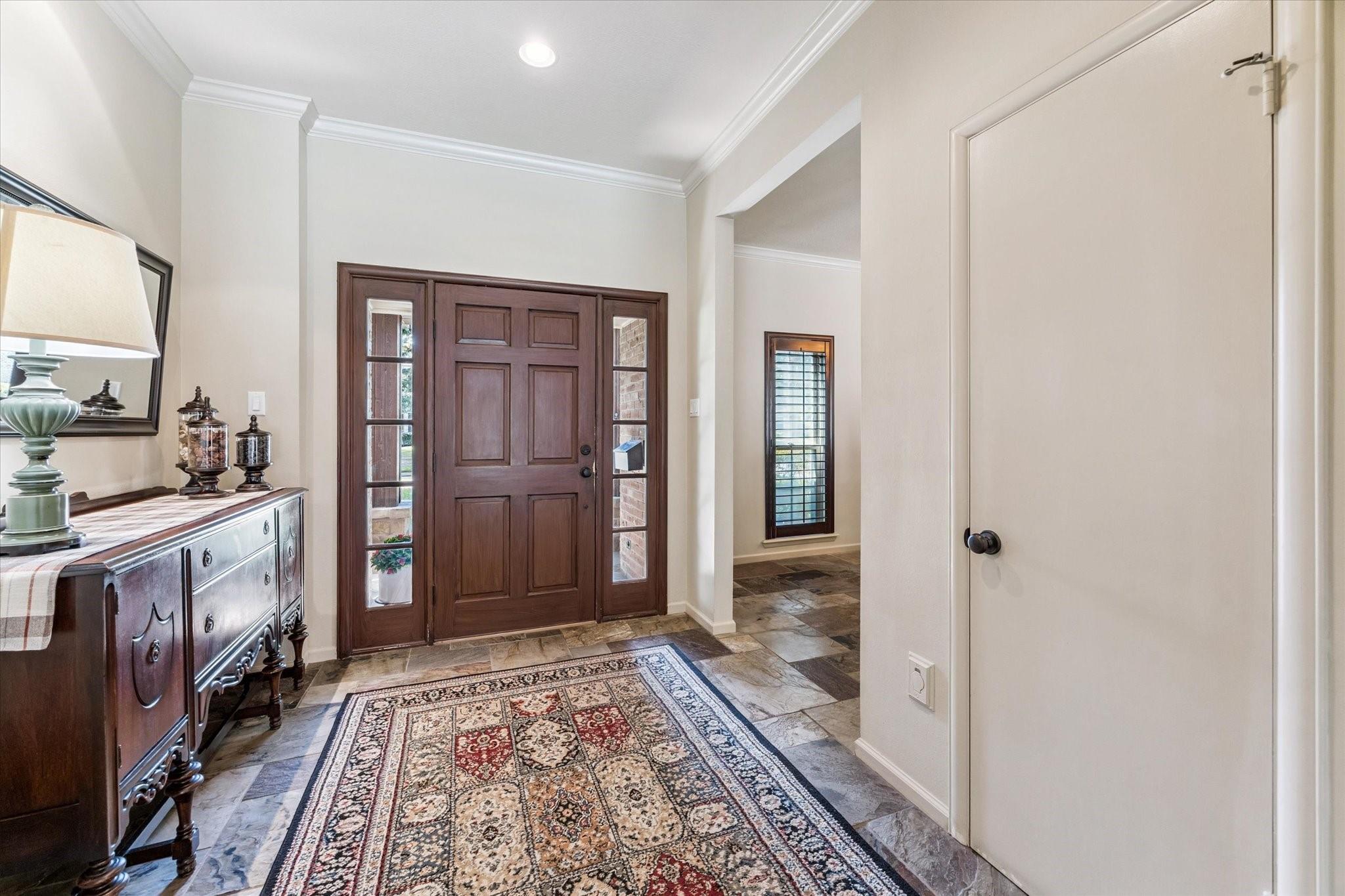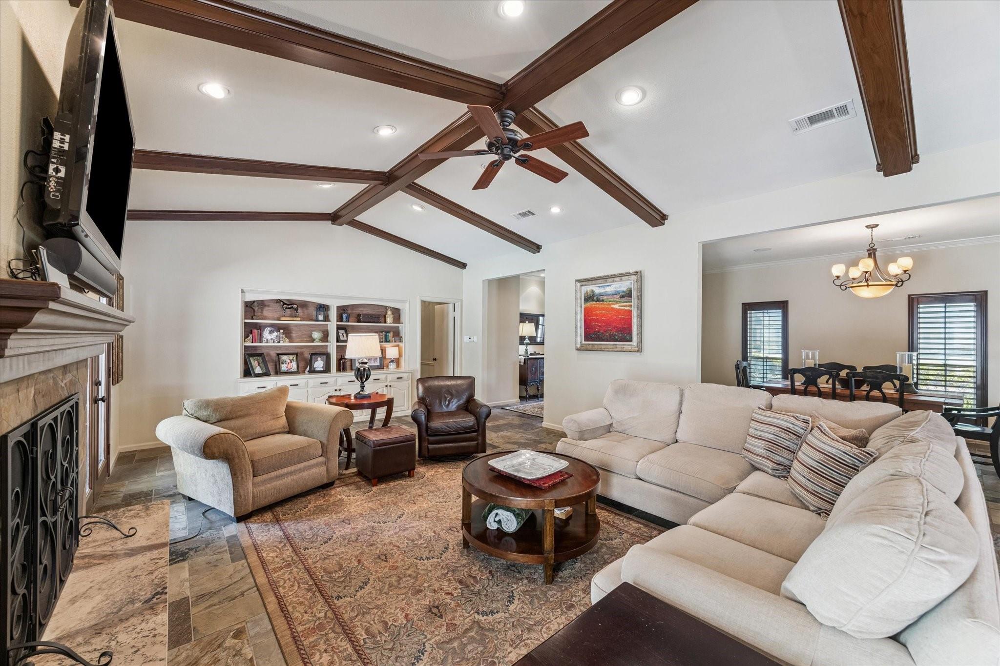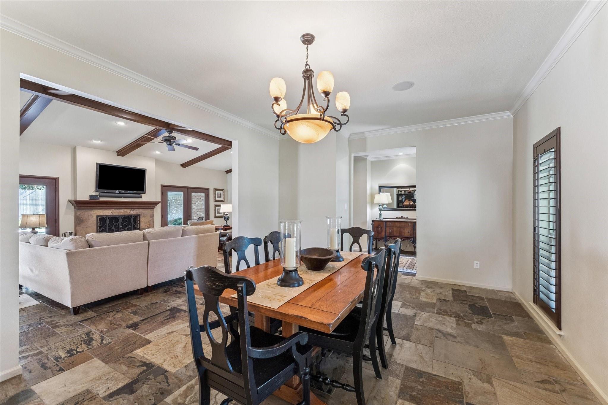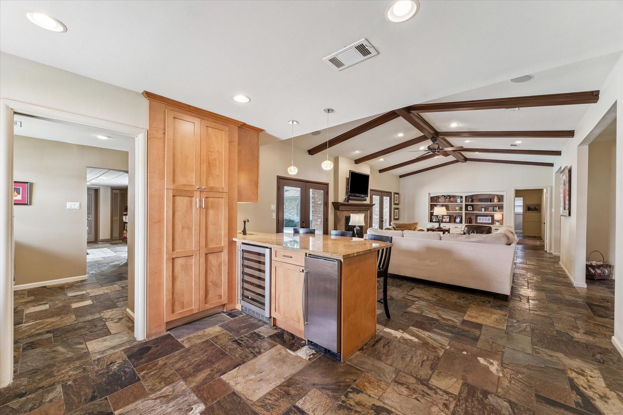 Coveted one-story home in Frostwood! Nestled on a quiet cul-de-sac, this residence boasts high ceilings, slate floors, and a thoughtfully designed floor plan with four bedrooms, three full bathrooms, a powder bath, and a game room. The expanded kitchen features granite counters, a gas range, two ovens, and a built-in refrigerator. Entertain with ease in the wet bar, complete with ice maker, wine refrigerator, sink, and counter seating, opening seamlessly to the family room. The family room is accented with vaulted, beamed ceilings, built-in bookshelves, and a central gas log fireplace framed by French doors that open to the backyard. The large primary suite offers a spa-like bath with a double-head walk-in shower, separate tub, dual vanity areas, and two walk-in closets. Enjoy year-round outdoor living with a sparkling pool, covered patio, built-in grilling area, and bar seating. Zoned to highly sought-after schools, including Bunker Hill Elementary, Memorial Middle, and Memorial High.