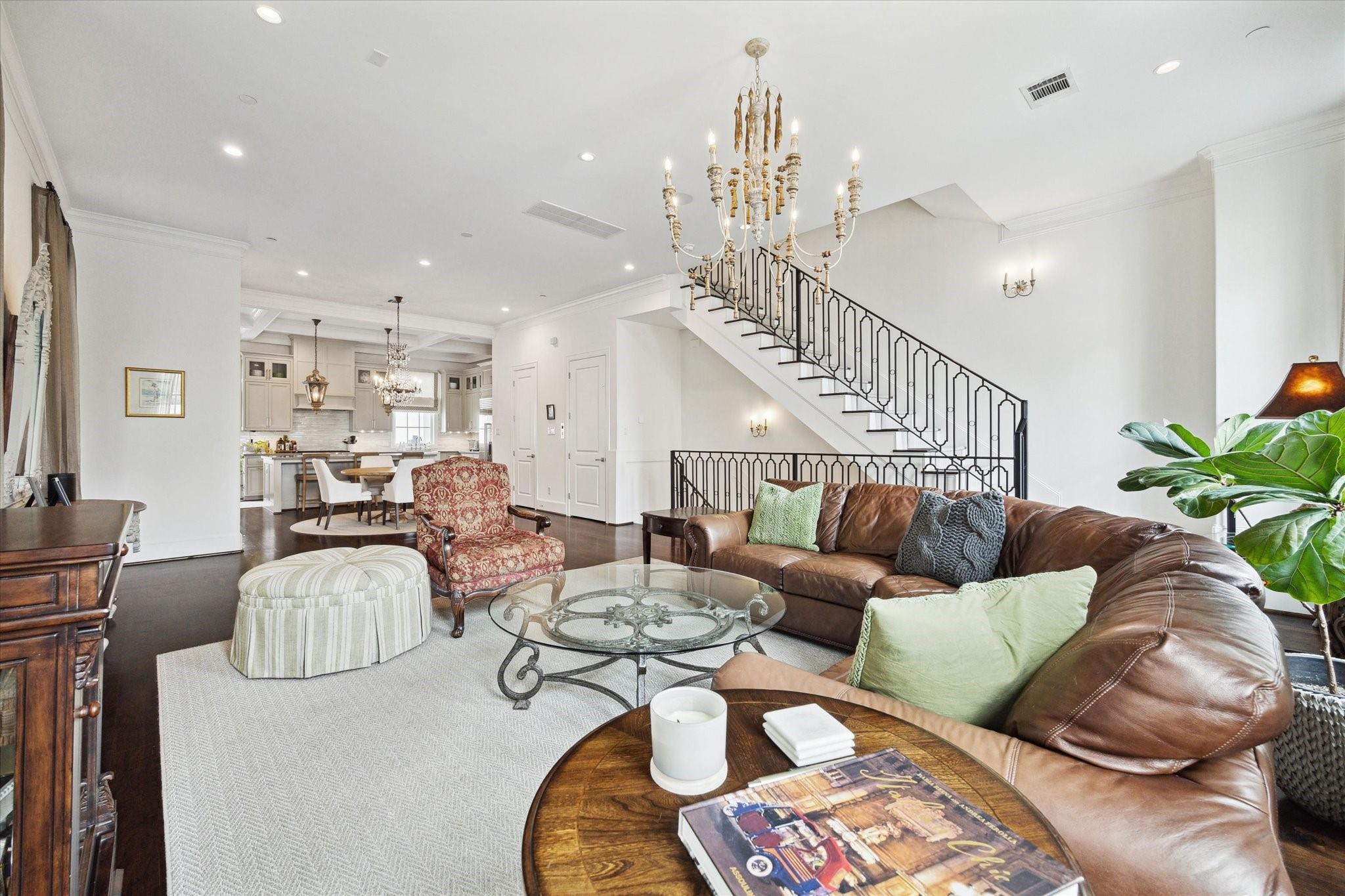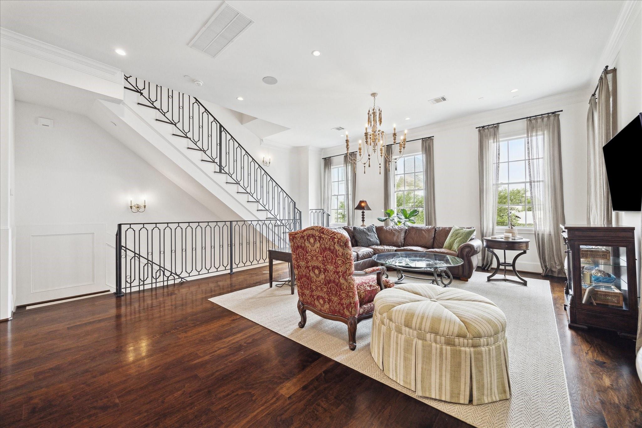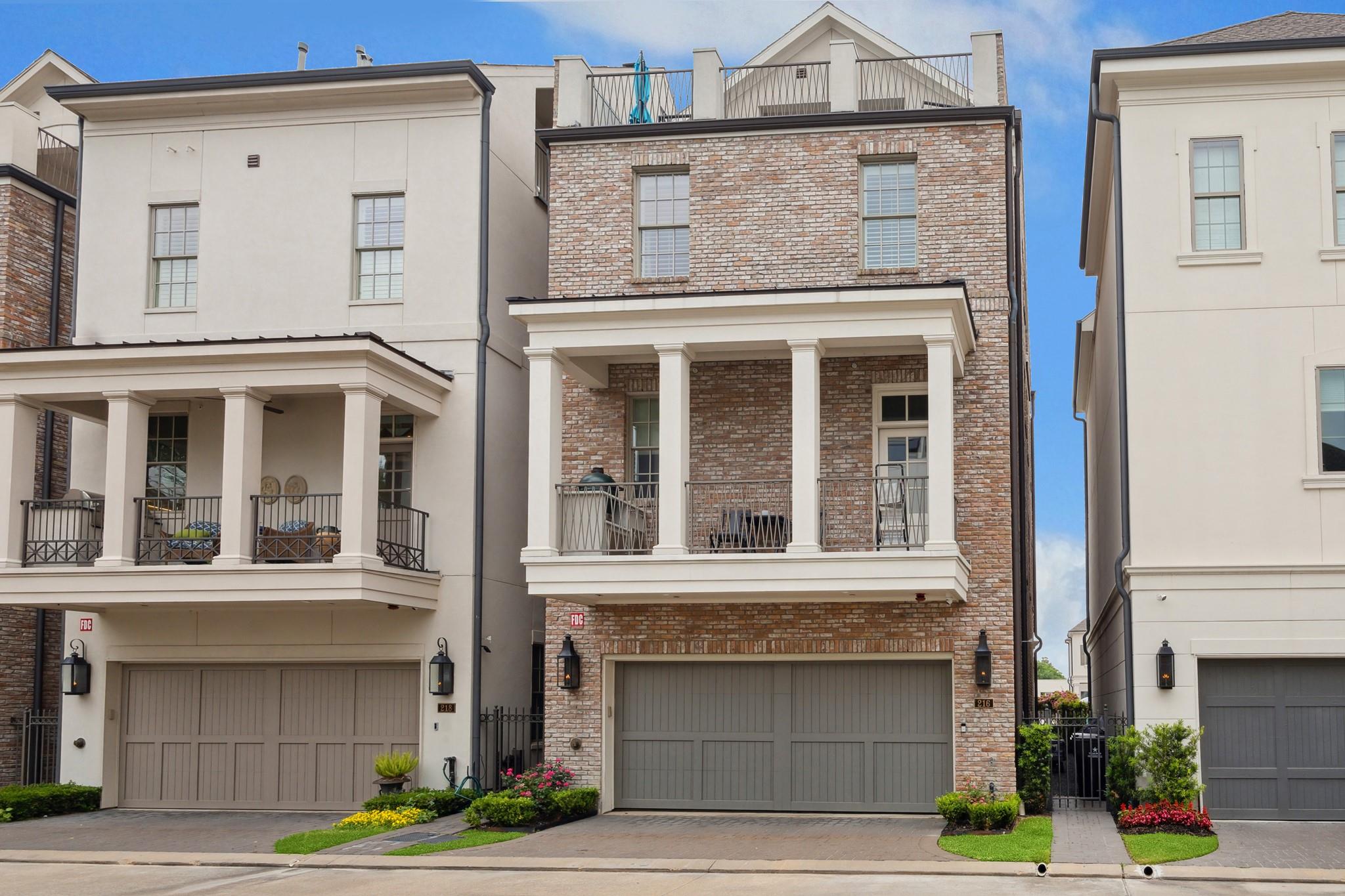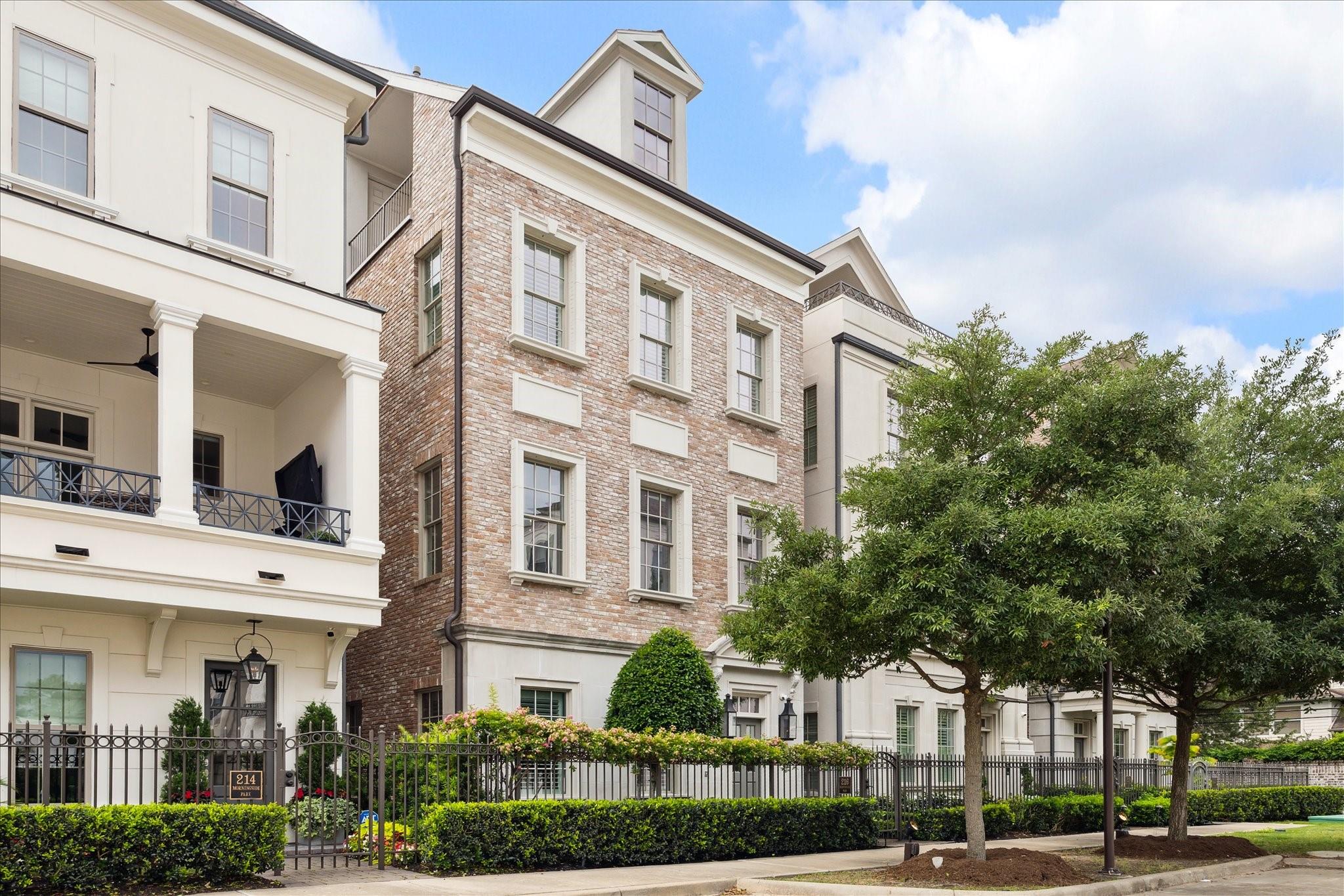 Located in the coveted gated community of Memorial Green, this 4-story home offers elevated living with timeless design. Built by Pelican Builders with interiors by Julie Dodson, every detail reflects luxury and sophistication. The brick exterior and copper gas lanterns, make a striking first impression. The entry-level features an elevator, garage access, and a study or guest suite with an en-suite bath. The second-floor living, dining, and kitchen areas flow seamlessly--ideal for entertaining and everyday living with a convenient half bath. The kitchen has an island, stainless appliances, a gas range, designer finishes, and a balcony perfect for grilling or a kitchen garden. The third floor offers the primary suite with a spa-inspired bath and walk-in closet, plus a guest suite and laundry. The fourth level has a game room or additional bedroom with a full bath, and a terrace. Enjoy a true lock-and-leave lifestyle steps from upscale shops and dining, and zoned to exemplary schools.