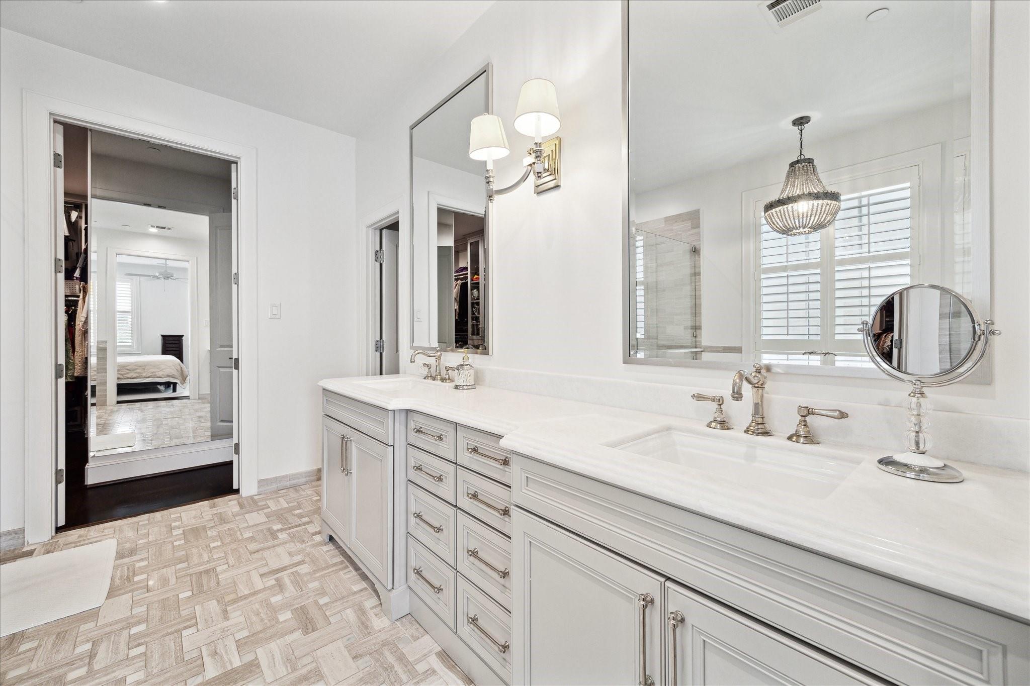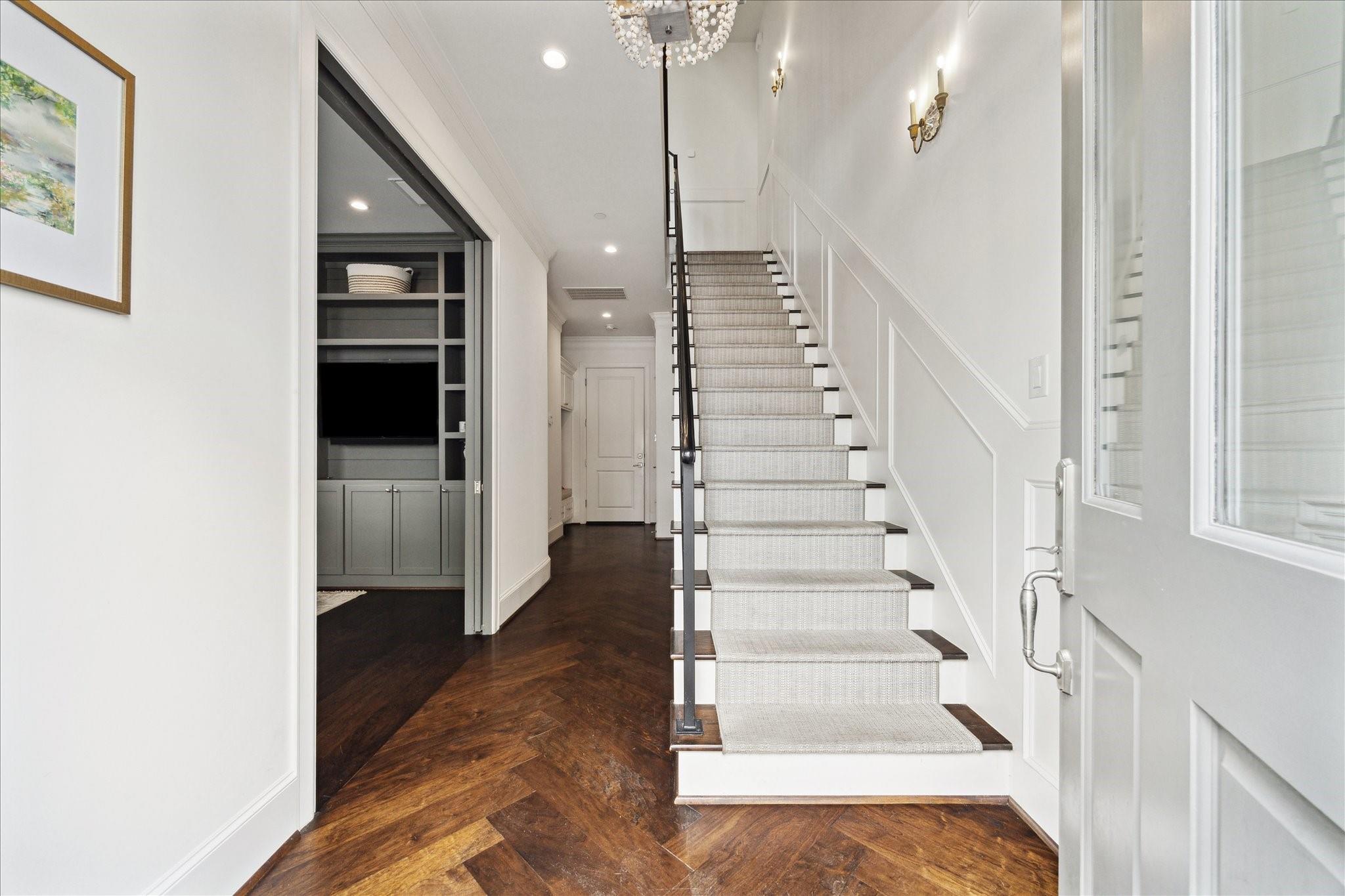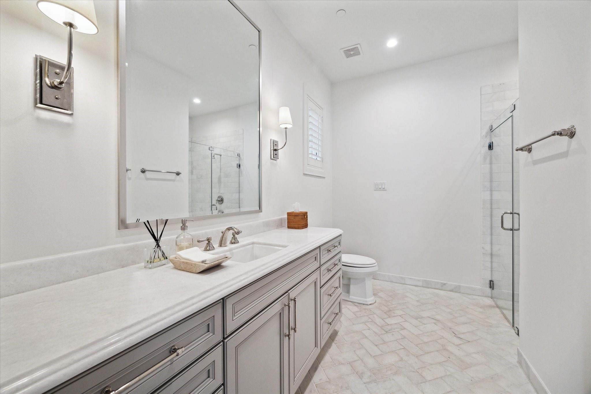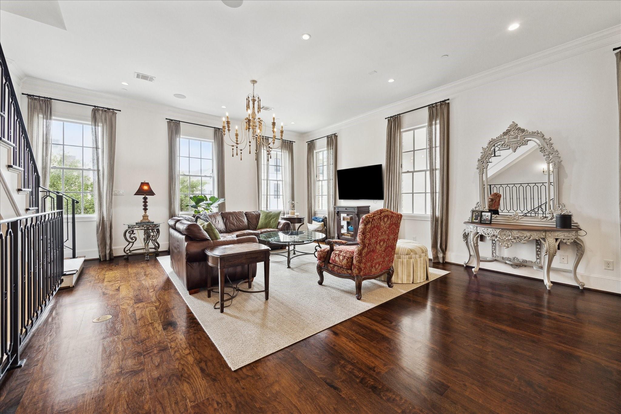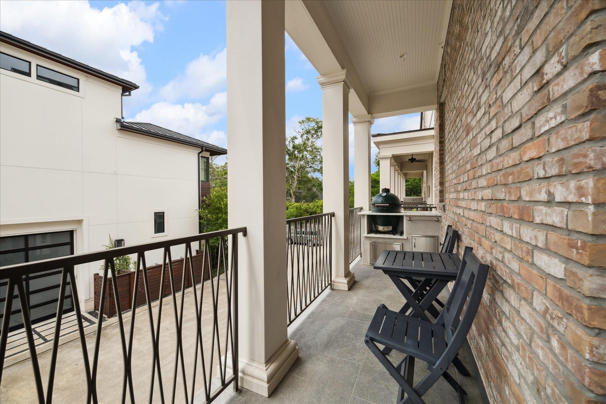 Located in the coveted gated community of Memorial Green, this 4-story home offers elevated living with timeless design. Built by Pelican Builders with interiors by Julie Dodson, every detail reflects luxury and sophistication. The brick exterior and copper gas lanterns, make a striking first impression. The entry-level features an elevator, garage access, and a study or guest suite with an en-suite bath. The second-floor living, dining, and kitchen areas flow seamlessly--ideal for entertaining and everyday living with a convenient half bath. The kitchen has an island, stainless appliances, a gas range, designer finishes, and a balcony perfect for grilling or a kitchen garden. The third floor offers the primary suite with a spa-inspired bath and walk-in closet, plus a guest suite and laundry. The fourth level has a game room or additional bedroom with a full bath, and a terrace. Enjoy a true lock-and-leave lifestyle steps from upscale shops and dining, and zoned to exemplary schools.